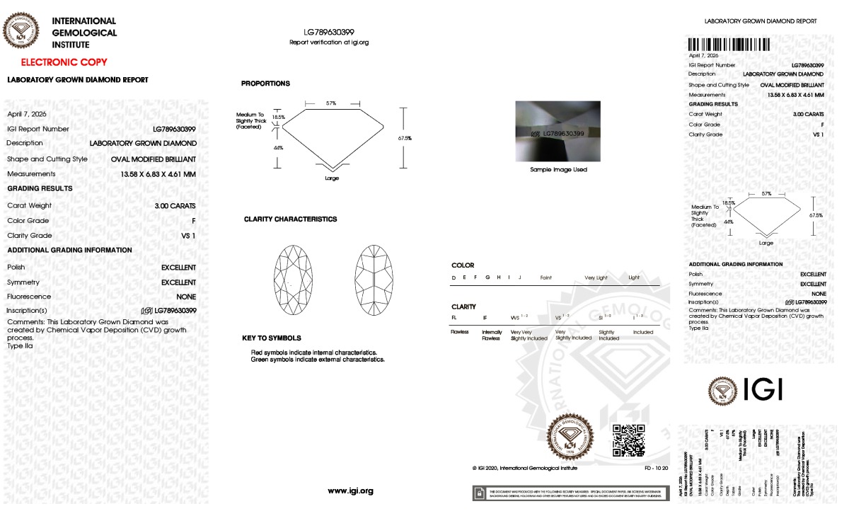 Lab Grown-OV, F, VS1, IGI #LG789630399, 127-